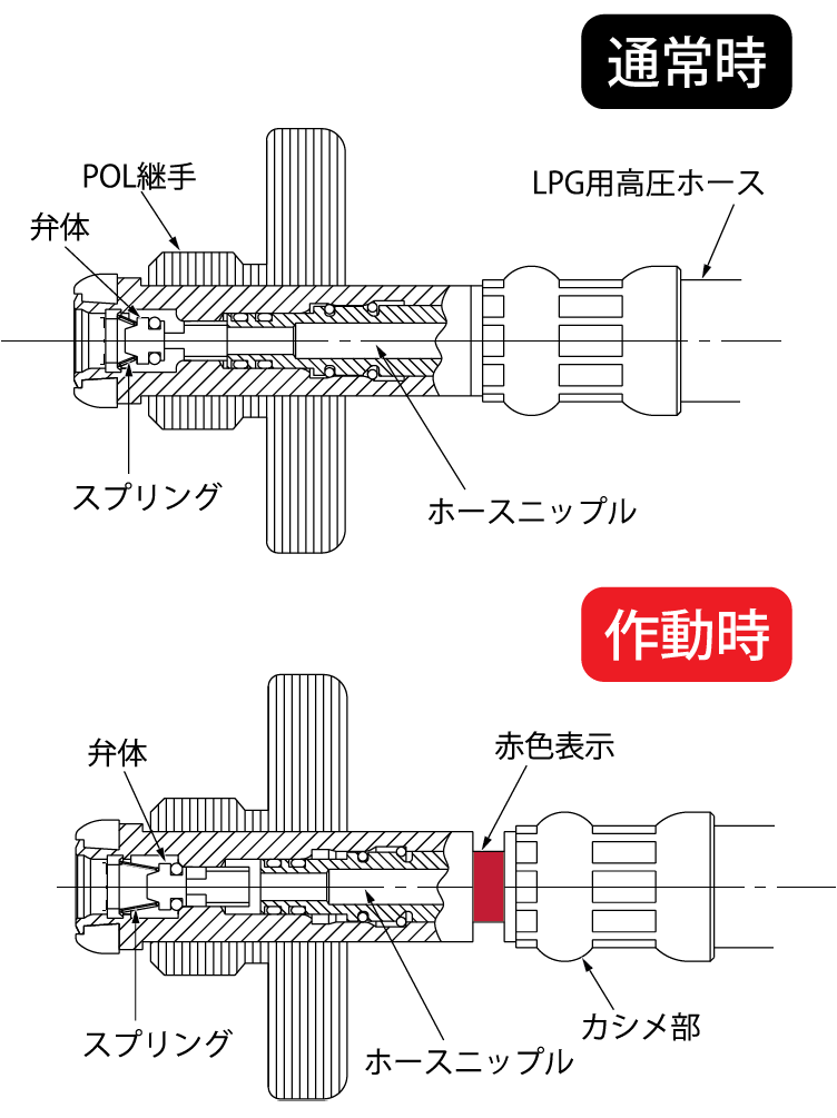 高圧ホースに一定以上の張力が働くとホ-スニップルが移動し、スプリングの力によってボールがシート部に押さえられ、ガスの流路を遮断します。